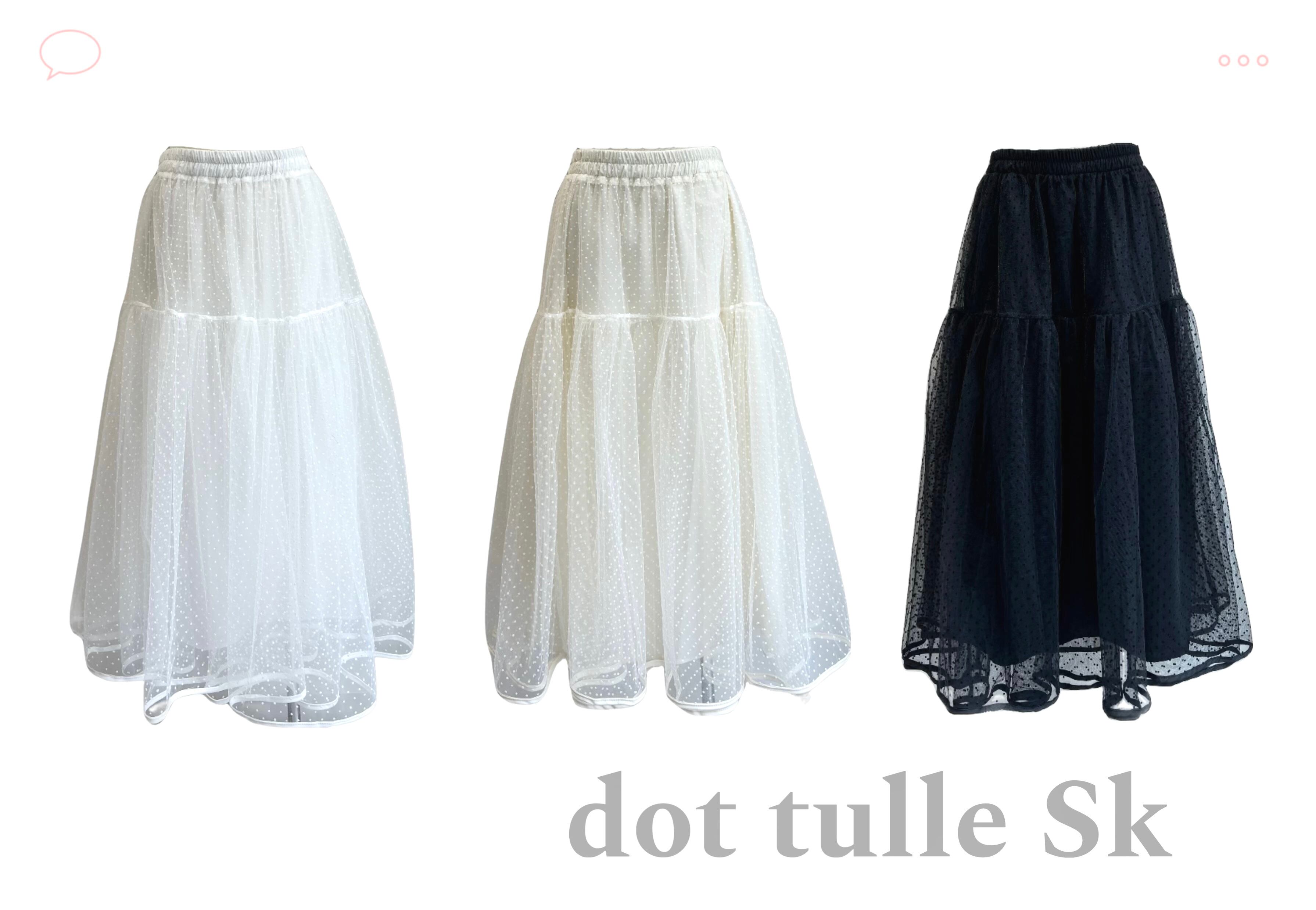 ドットチュールスカートで可愛いスタイルを。透け感のあるチュール生地にプリントされた小さなドット柄が、女性らしさを引き立てる一着。ウエスト部分にはゴムが入っているので、着心地も抜群です。長めの丈感が縦のラインを強調し、スタイルアップも叶えます。カジュアルにもキレイめにも合わせやすいアイテムで、1枚でおしゃれ感をプラスしてくれること間違いなし。