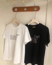 リボンステッチが施された可愛らしいTシャツ。シンプルでありながらも個性的なアイテム。