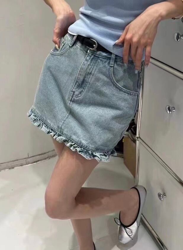 裾がフレアになっている可愛いデニムスカート。女性らしいシルエットとデニム素材の組み合わせが魅力です。さらに、インナーパンツが付いているので安心して着用できます。デートやお出かけにもぴったりのアイテムです。