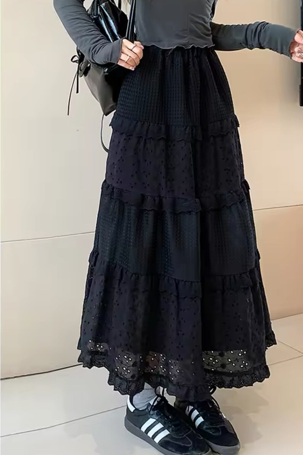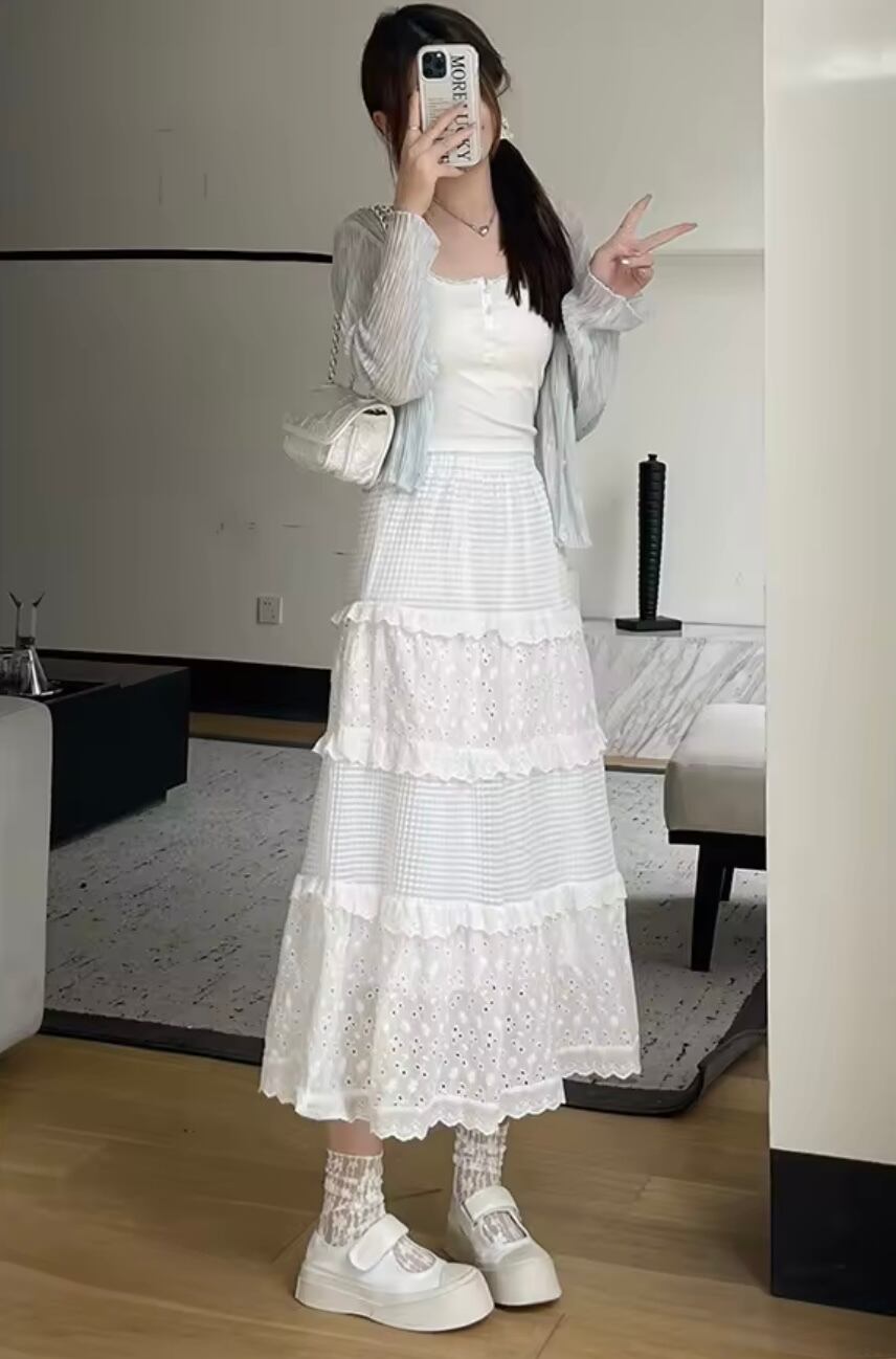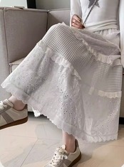 繊細なアイレットレースが女性らしさを引き立てる、ふんわりスカートが登場しました。ウエスト部分はゴム入りで、着心地抜群。軽やかな素材感が暖かい季節に最適です。シンプルなトップスと合わせるだけで、一気に可愛らしさを演出できるアイテムです。