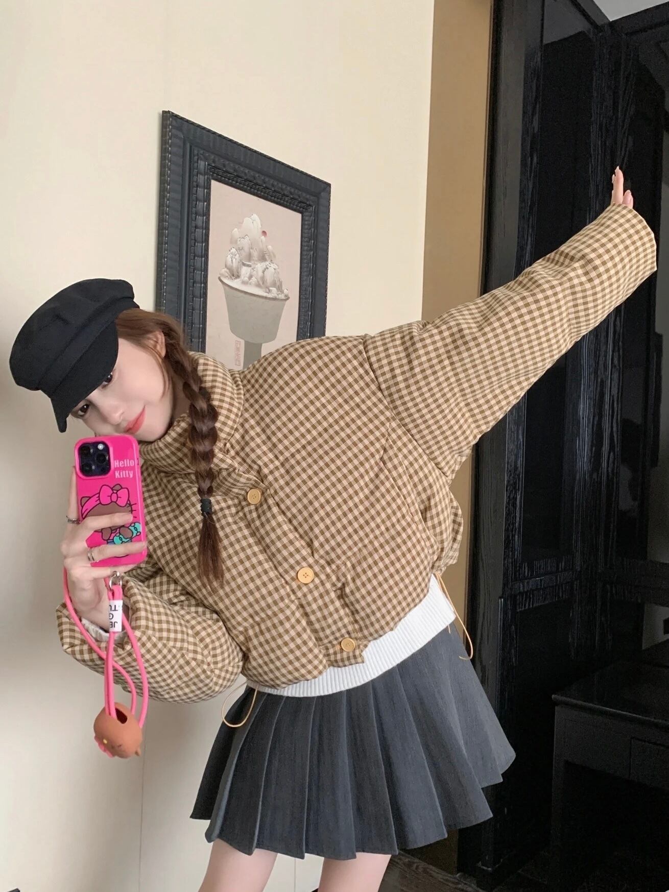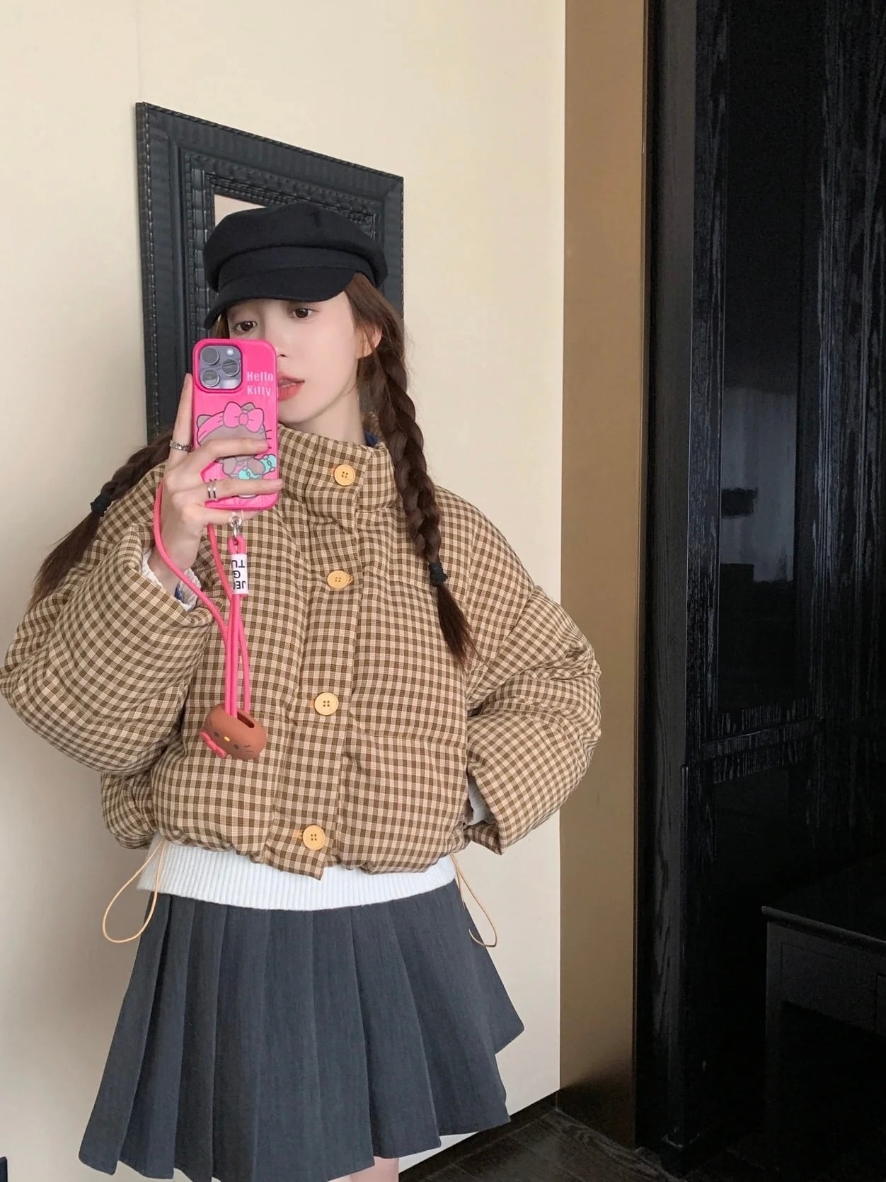 ギンガムチェックダウンジャケットは、可愛らしいデザインが特徴のアウターです。小さなギンガムチェック柄が全体を覆い、女性らしい印象を与えてくれます。襟元のボタンがアクセントになっており、着こなしに遊び心を加えてくれる一着です。ダウンジャケットなので、暖かさもしっかり確保してくれます。